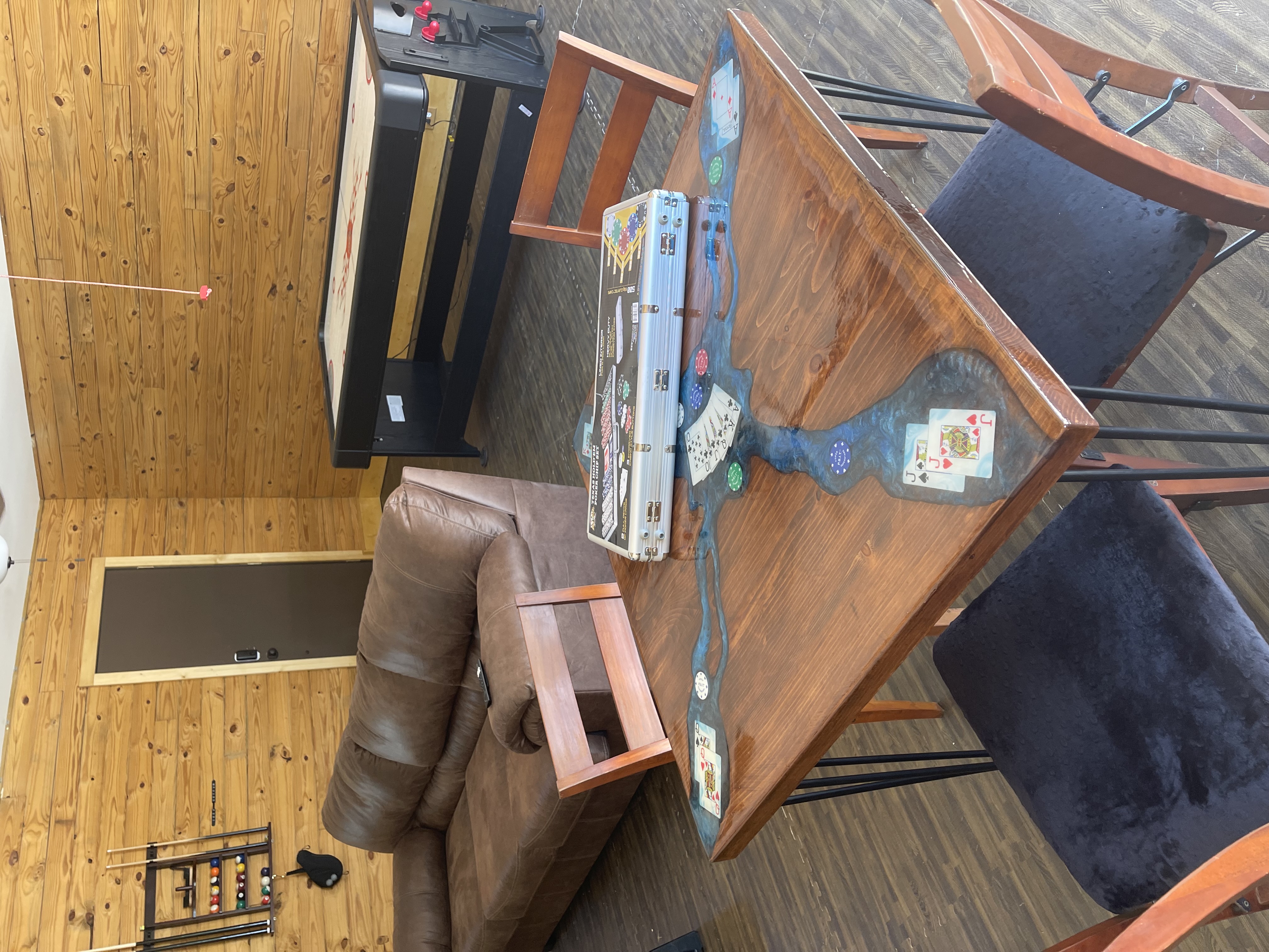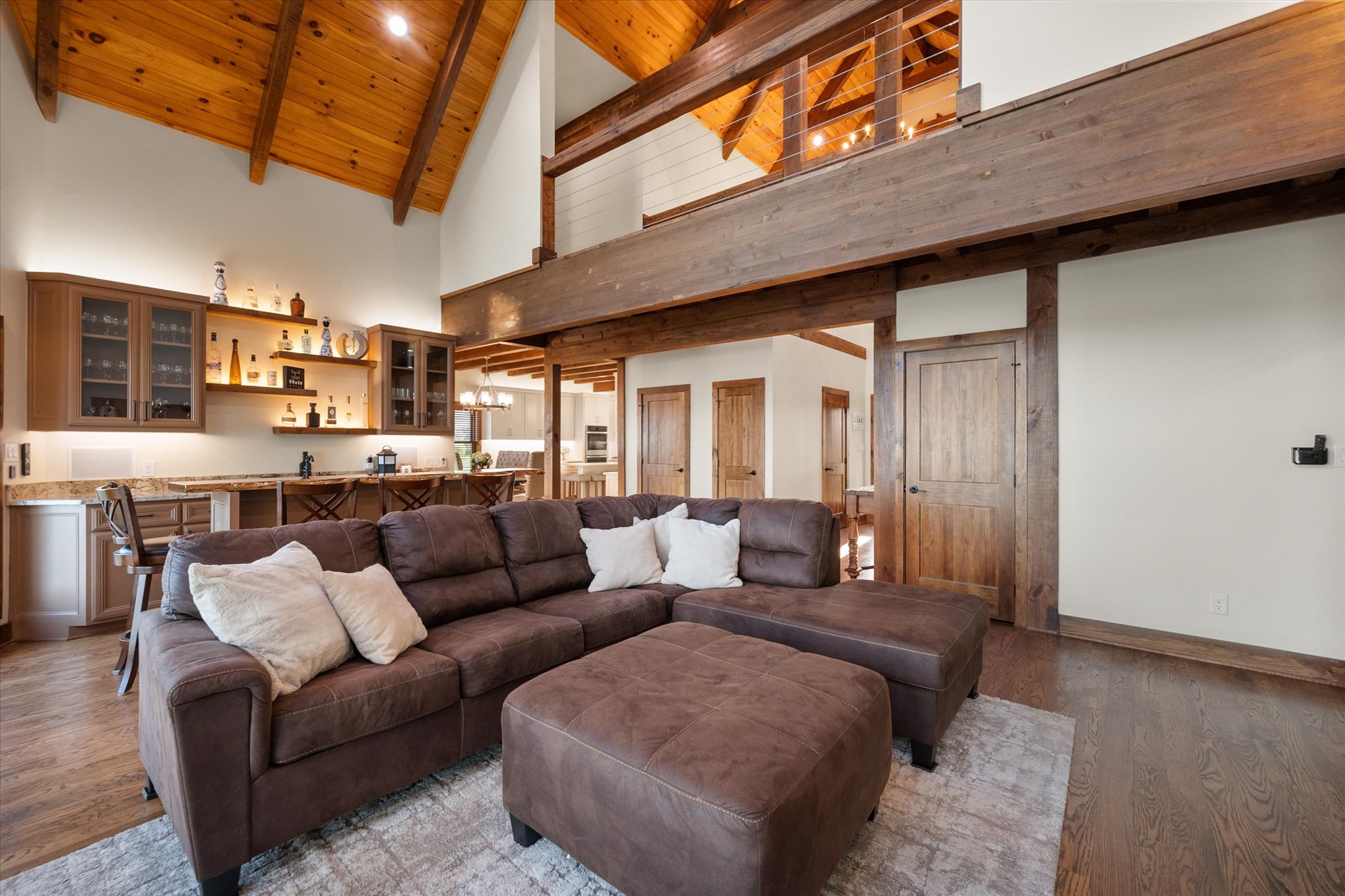 Inside, you'll find a gourmet kitchen and outdoor BBQ ideal for food lovers, a one-of-a-kind live-edge dining table for unforgettable meals, and a cozy family room with a fireplace, wet bar, and large-screen TV for relaxing evenings.